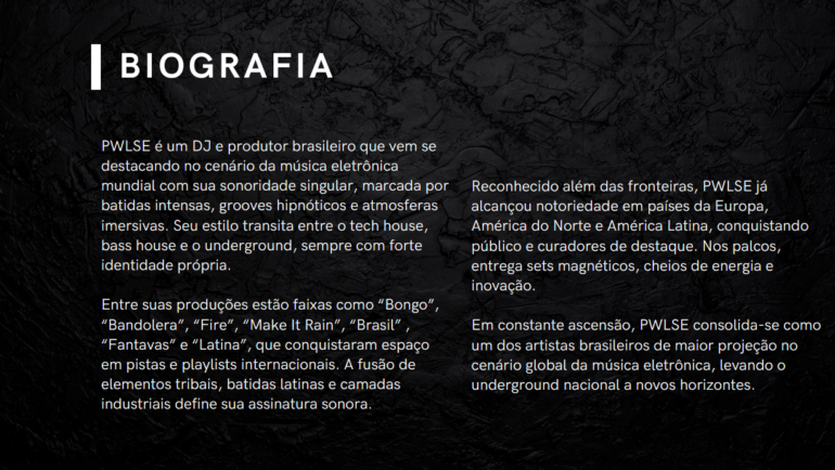 Bénéficiant d'une popularité sans cesse croissante, PWLSE s'impose comme l'un des artistes brésiliens les plus en vue de la scène musicale électronique mondiale, propulsant la scène underground nationale vers de nouveaux horizons.